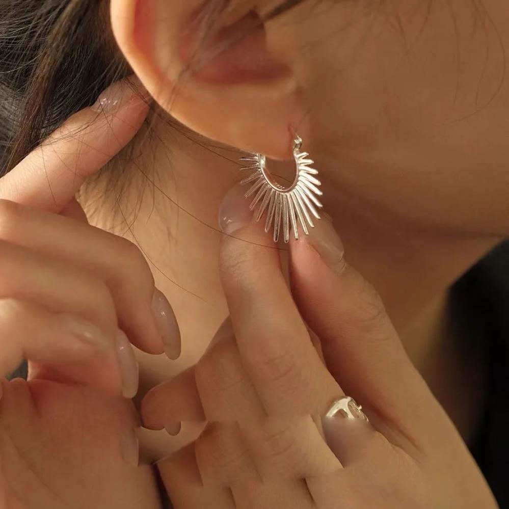 حلق فضي بتصميم شمس متألق من BF CLUB، مصنوع من فضة 925 عالية الجودة، يمنحك لمسة لامعة أنثوية مثالية للمناسبات أو الإطلالات اليومية بلمسة جريئة وعصرية.